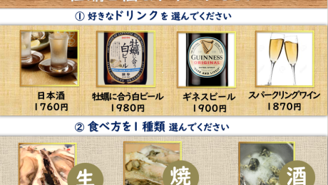 - 日本酒、牡蠣に合う白ビール、ギネス黒ビール、スパークリングワイン お好きなドリンク1つお選びください。